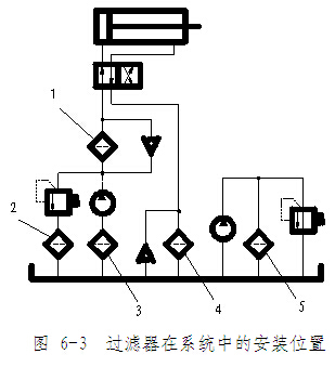 (3)安裝在系統的回油路上 ①可以濾掉液壓元件磨損后生成的金屬屑和橡膠顆粒,保護液壓系統;②允許采用濾芯強度和剛度較低的過濾器;③為防止濾芯堵塞等引起的系統壓力升高,需要與過濾器并聯一單向閥起旁通閥作用。如圖6-3中過濾器2、5。