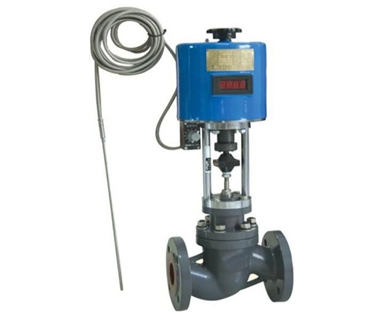 加熱型電動溫控閥工作前主閥芯處于半開位置,傳感器處于自然狀態。接上電源,主閥芯全開。介質由箭頭方向流入主閥體、經閥芯對儲熱箱進行加熱。當溫度升到相應設定值時,傳感器即產生相應線性信號輸入一體化智能執行機構,隨即驅動閥桿、閥芯產生位移,關閉主閥芯停止加熱。當溫度低于設定值時,傳感器即產生線性信號輸入執行機構,驅使閥芯漸開,使介質按拋物線特性流入儲熱箱,進行加熱直至設定值。這樣被控介質始終在設定溫度范圍內被控制,從而達到控溫目的。